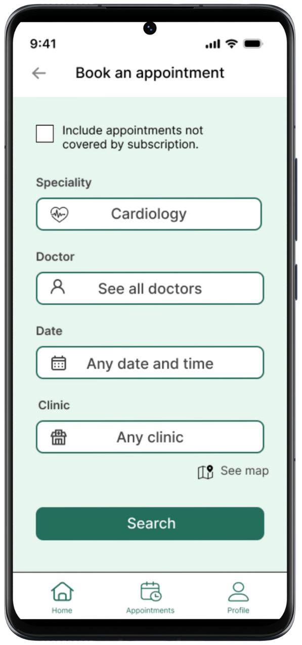 As users had expressed several factors that they considered important in how they chose their doctor, we designed the filter page to allow them to select as many core criteria as they wanted from the same page.