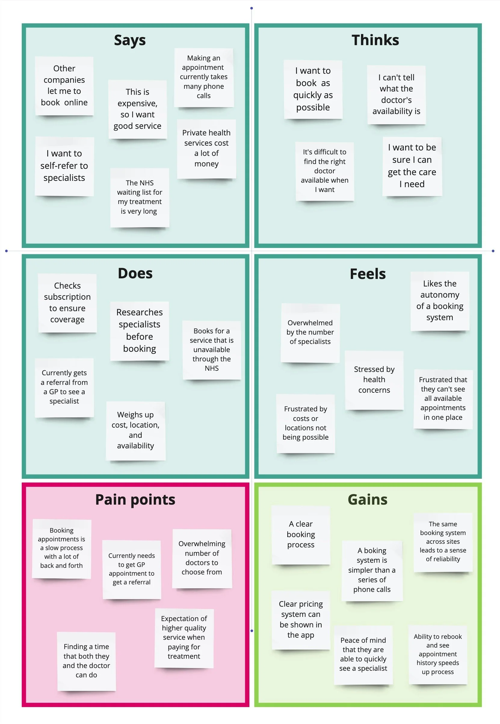 We conducted interviews with 6 people, covering their experiences of booking systems, past use of private healthcare, and priorities when choosing healthcare providers.